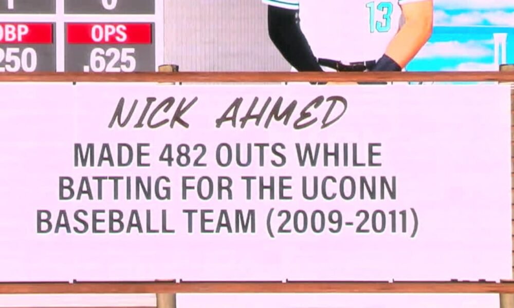 When Ahmed stepped to the plate for the principle time in the 2nd inning, the board urged the crowd that he attended UConn, including a parenthetical “Ride Aztecs.” The San Diego fans booed in unison. For the duration of the at-bat, this “fun fact” regarded: “Made 482 outs whereas batting for the UConn baseball team.”